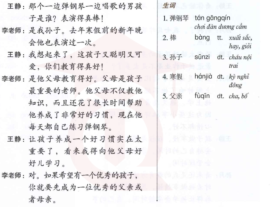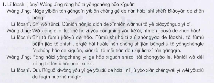 课文 1:李老师建议王静让孩子养成好习惯 (Cô giáo Lý đề xuất Vương Tinh nên để đứa trẻ nuôi dưỡng các thói quen tốt)