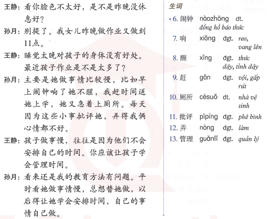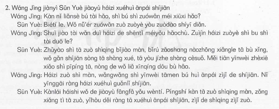 课文 2:王静建议孙月教育孩子学会安排时间 (Vương Tinh đề xuất Tôn Nguyệt nên dạy đứa trẻ học cách sắp xếp thời gian)