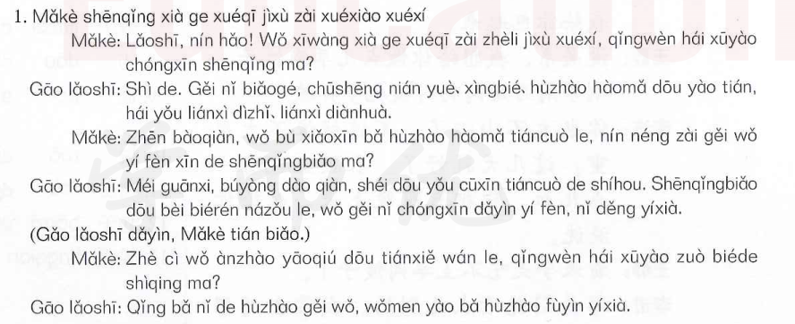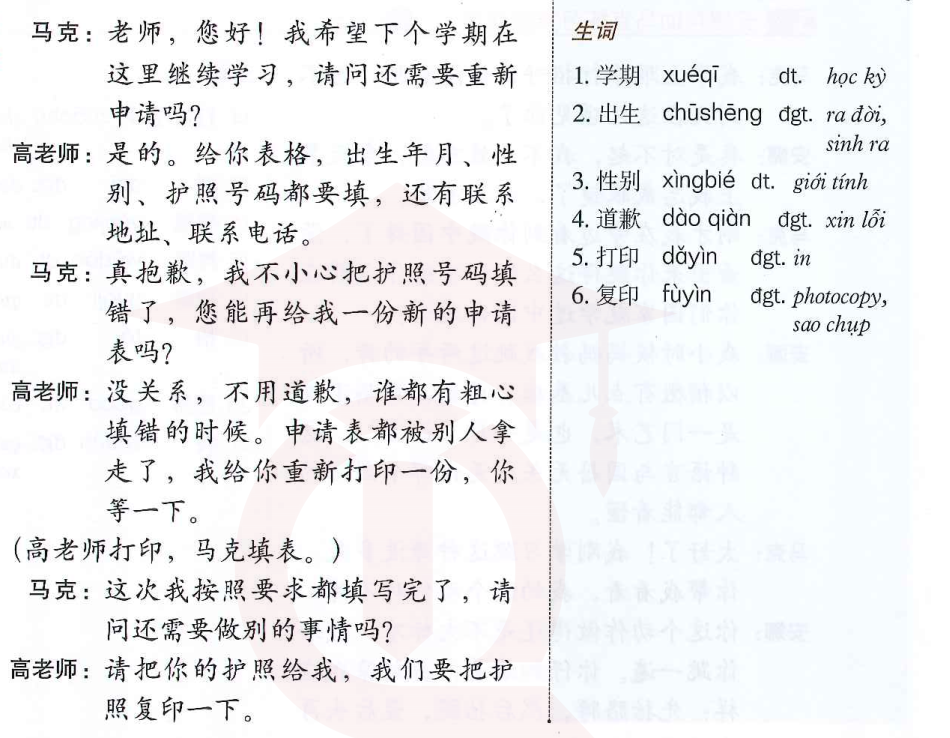 课文 1:马克申请下个学期继续在学校学习 (Mark xin phép kỳ sau tiếp tục được học tập tại trường)