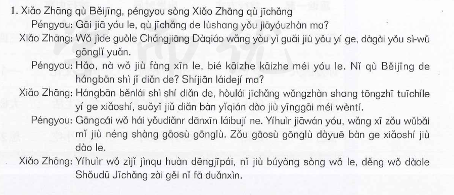 课文 1:小张去北京,朋友送小张去机场(Bạn của Tiểu Trương tiễn anh ấy đi ra sân bay đến Bắc Kinh)