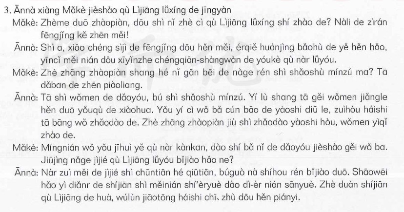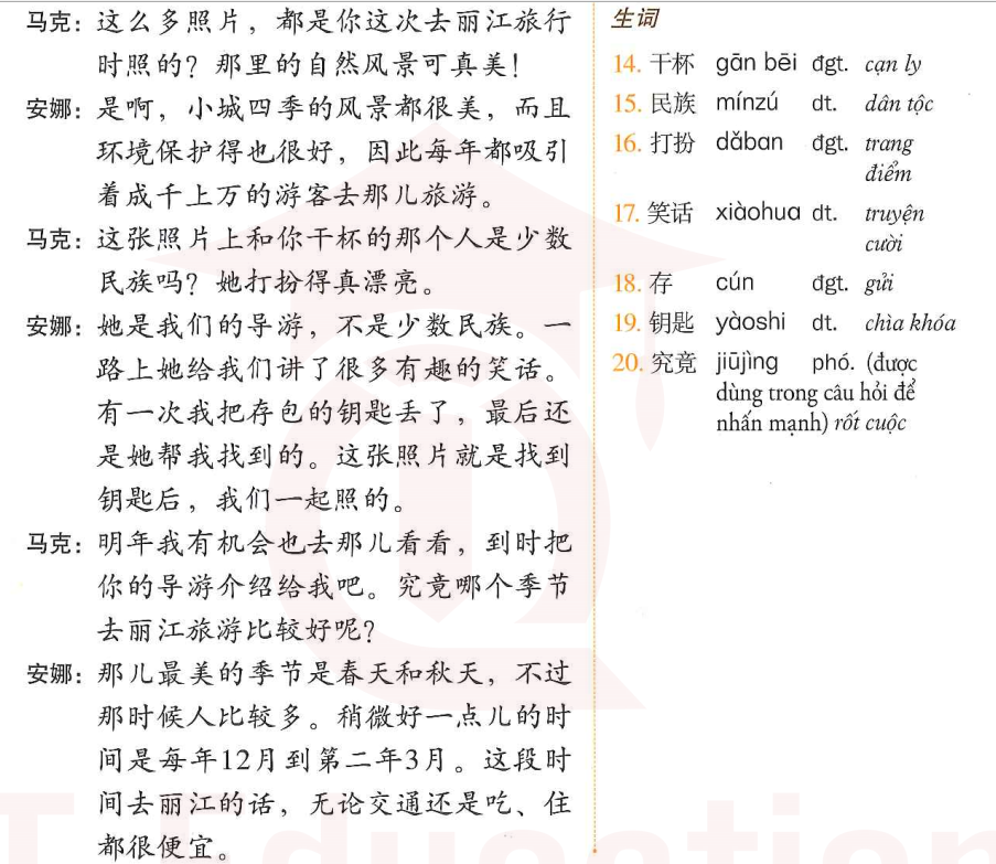 课文 3:安娜向马克介绍去丽江旅行的经验(Anna chia sẻ kinh nghiệp đi du lịch Lệ Giang với Mark)